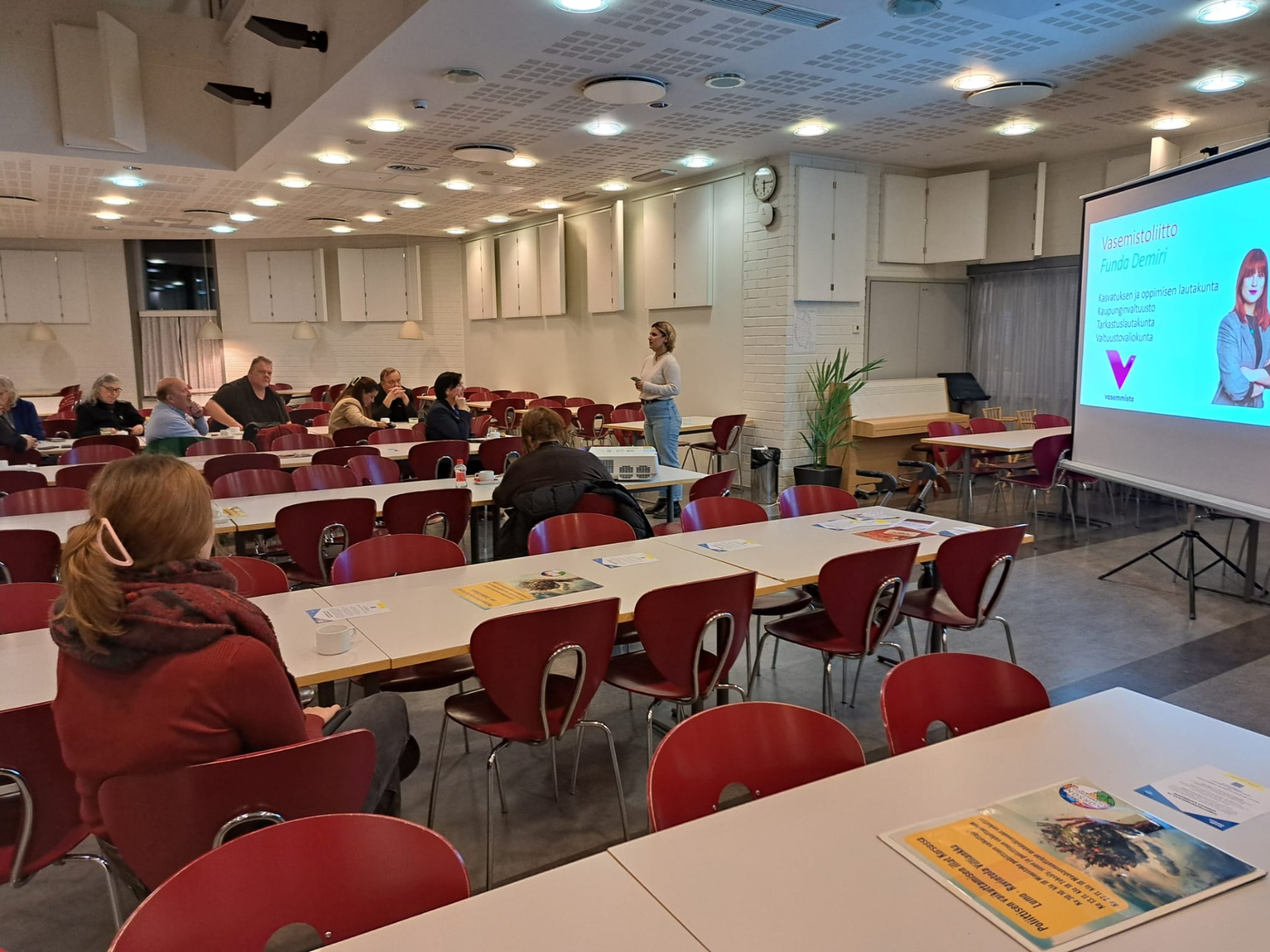 Tilaisuudessa Vaula Norrena Vihreistä kertoo Vantaan Kaupunkiympärisölautakunnan toiminnasta. Timo Jelekäinen SDP esittelee Vanhusneuvoston työtä. Loviisa Kaartokallio KD ja Visa Tammi SDP kertovat Vantaan kaupungin uudesta kaupunkistrategiasta 2026-2029. Esittelyssä ovat myös Vammaisneuvoston ja Nuorisovaltuuston toiminta. Vantaan nuorisovaltuuston toimintaa esittelevät Brianna-Ann Awahnde ja Joel Rasku, kuvassa.